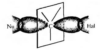 Образование переходного состояния сопровождается изменением гибридного состояния атома углерода с sр3 на sp2, Одна доля негибридизованной р-атомной орбитали атома углерода в переходном состоянии частично перекрывается с орбиталью атакующего нуклеофила, а вторая – с орбиталью атома галогена. Возвращение атома углерода в sр 3-гибридное состояние после отщепления галогенид-иона происходит с обращением конфигурации.