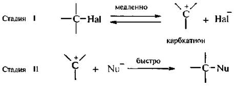 На первой стадии происходит диссоциация молекулы галогеналкана при участии молекул протонного полярного растворители. В результате образуются карбкатион и галогенил-ион. Поскольку процесс ионизации протекает медленно, то 1 стадия определеят скорость всей реакции. На второй стадии образовавшийся карбкатион быстро реагируете нуклеофилом. Протеканию реакции по механизму SN1 способствуют высокая ионизирующая и сольватирующая способность растворителя, а также стабильность образующегося карбкатиона. Устойчивость алкильных карбкатионов обусловлена делокализацией положительного заряда за счет +I-эффекта алкильных групп и возрастает в ряду: