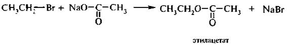 3. Взаимодействие с солями карбоновых кислот (ацетолиз). При действии солей карбоновых кислот на галогеналканы образуются сложные эфиры. Реакцию проводят в среде апротонного полярного растворителя.