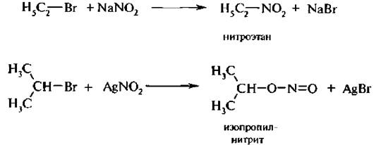 6. Взаимодействие с солями азотистой кислоты. Продукты, образующиеся в результате этой реакции, зависят от условий ее проведения, строения галогеналкана и соли.