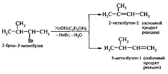 Поскольку отщепление водорода происходит от β -атома углерода, то такие реакции называются β - или 1.2-элиминированием. Реакции элиминирования (Е) и нуклеофильного замещения (SN2) конкурируют друг с другом, но в определенных условиях каждая из них может стать доминирующей. Отщепление галогеноводорода от галогеналкана становится основным процессом в присутствии нуклеофильных реагентов, обладающих высокой основностью. К ним относятся спиртовые растворы гидроксидов щелочных металлов или алкоголяты щелочных металлов. Элиминированию способствуют также повышение температуры реакционной смеси и концентрации реагентов. Так, при взаимодействии йодэтана с водным раствором щелочи основным направлением реакции является нуклеофильное замещение, а продуктом реакции – этиловый спирт. При использовании спиртового раствора щелочи доминирующим процессом становится реакция элиминирования, продуктом реакции – этилен.
