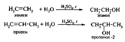 Спирты получают различными синтетическими способами. 1. Гидратация алкенов. При гидратации этилена получают первичный спирт, его гомологи образуют вторичные и третичные спирты: