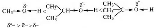 Из-за низкой кислотности спирты почти не вступают в реакцию со щелочами. Кислотные свойства спиртов уменьшаются при переходе от первичных спиртов к третичным: