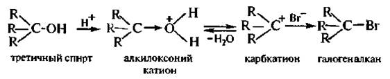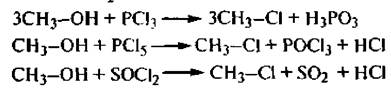 С йодоводородной и бромоводородной кислотами реакция протекает легко, с хлороводородной – значительно труднее. Первичные и вторичные спирты реагируют с хлороводородной кислотой только в присутствии хлорида цинка (кислоты Льюиса). Первичные, вторичные и третичные спирты при взаимодействии с реактивом Лукаса (эквимолярным и количествами концентрированной хлороводородной кислоты и цинка хлорида) с различной скоростью образуют галогенопроизводные углеводородов. Проба Лукаса используется для распознавания первичных, вторичных и третичных спиртов. 5. Взаимодействие с галогенангидридами неорганических кислот. Спирты взаимодействуют с галогенидами фосфора (РСl3, РСl5 и др.) и тионилхлоридом (SOCl2) с образованием галогеналканов: