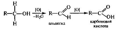 6. Окисление. Спирты окисляются под действием кислорода воздуха в присутствии катализаторов (Сu, СuО) и различных неорганических окислителей – оксида хрома (VI), хромовой смеси (дихромата калия в серной кислоте), перманганата калия в серной кислоте и др. Первичные спирты образуют альдегиды (при дальнейшем окислении – карбоновые кислоты с тем же числом углеродных атомов).