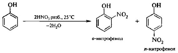 2. Нитрование. Если бензол нитруется только нитрующей смесью, то фенол можно нитровать разбавленной азотной кислотой при комнатной температуре;