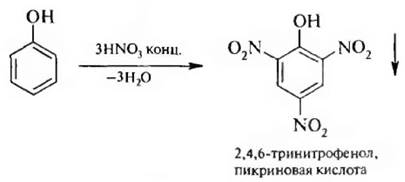 Свободные нитрофенол – бесцветные вещества или имеют желтую окраску. При добавлении щелочей образуются соли нитрофенолов, окрашенные в ярко-желтый цвет. При действии концентрированной азотной кислоты на фенол образуется осадок 2, 4, 6-тринитрофенола: