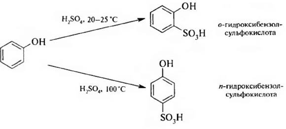 2, 4, 6-Тринитрофенол называется пикриновой кислотой, по кислотности он приближается к серной кислоте, 3. Сульфирование. Сульфирование фенола проходит очень легко и в зависимости от температуры приводит к о- или п -изомерам: