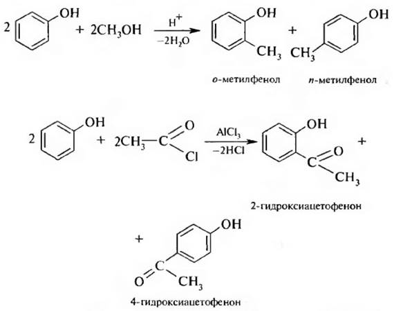 4. Алкилирование и ацилирование. Реакции алкилирования и ацилирования по бензольному кольцу (С-алкилирование и С-ацилирование фенолов) проводят в условиях реакции Фриделя – Крафтса;