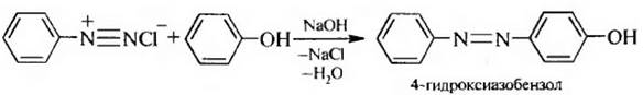 5. Азосочетание. Фенолы в качестве азосоставляющей в слабощелочной среде вступают в реакцию азосочетания с солями диазония с образованием азосоединений: