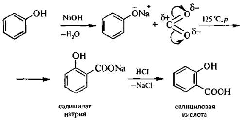 6. Синтез фенолкарбоновых кислот (реакция Кольбе – Шмитта). При пропускании углекислого газа через раствор фенолята натрия образуется салицилат натрия, который при действии минеральных кислот образует салициловую кислоту.