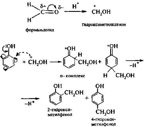 7. Гидроксиметилирование. При обработке фенолов формальдегидом в кислой или щелочной среде образуется смесь о- и п- гидрокси-метилфенолов. Реакция протекает по механизму SE, электрофильной частицей в условиях кислотного катализа является гид рокси метилкатион +СН2ОН: