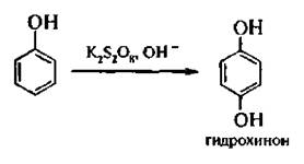 Фенолы, в зависимости от природы окислителя, могут образовывать разные продукты. В щелочной среде фенолы окисляются в большей степени, чем в нейтральной, это связано с образованием феноксид-иона. В результате сопряжения увеличивается электронная плотность на бензольном ядре, и оно становится еще более чувствительным к действию окислителей. При окислении фенола персульфатом калия K2S2O8 в щелочной среде образуется гидрохинон (реакция Эльбса):