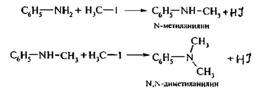 Анилин не образует соли с Н2СО3 На основность ариламинов существенное влияние оказывают заместители в бензольном кольце. Электронодонорные заместители увеличивают основность, а электроноакиепторные – уменьшают ее. При переходе от первичных к третичным основность ароматических аминов снижается. 1. Реакция алкилирования. Первичные и вторичные ариламины реагируют с галоген алканам и, образуя N-алкил- и N, N-диалкилариламины. Реакция протекает труднее в виду снижения нуклеофильных свойств атома азота.