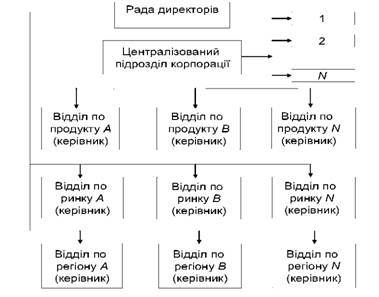 Між функціональними службами різних штабів встановлюється система функціональних зв'язків, яка забезпечує єдність і конкретність виконання спеціалізованих робіт. Проте зростання обсягу виробництва, різноманітність номенклатури продукції (робіт, послуг), яка випускається, й інші ринкові обставини ускладнюють завдання підтримки оптимальних функціональних зв'язків між штабами. Одним з напрямів удосконалення організаційних структур управління є виділення в складі виробничих підрозділів підприємств (організації) самостійних об'єктів управління - відділень. Ця система управління отримала назву дивізіональна структура управління (від англ. division - відділення). Дивізіональна структура управління Така структура належить до практики корпоративного управління, коли керована організація відноситься до розряду великих і найбільших за масштабом виробництва, чисельності тих, хто працює, а також характеризується різноманітністю продукції, яка випускається, великою місткістю ринків її збуту. Основою формування структури цього типу є виділення в складі організації практично самостійних виробничих відділень -" дивізіонів" (за продуктами, регіонами або ринками збуту) і надання їм оперативно-господарської самостійності в отримані прибутку при централізованому контролі із загально корпоративних питань стратегії, наукових досліджень, інвестицій, кадрової політики та інших централізованих функцій (рис. 4.5). Головними виконавцями при дивізіональній структурі управління є керівники виробничих відділень. Організаційна побудова відділень проводиться за такими ознаками: а) за продукцією (послугами) продуктова спеціалізація або продуктова структура управління; б) за ринками, з орієнтацією на споживача - споживча або ринкова спеціалізація; в) за обслуговуванням географічних регіонів - регіональна або географічна спеціалізація.