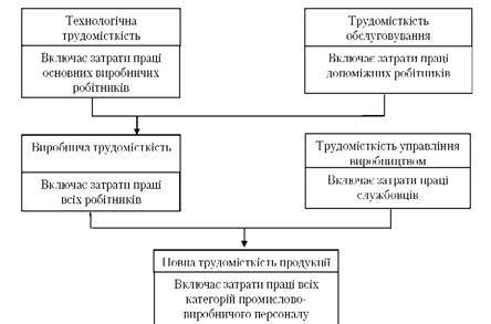 Залежно від складу витрат праці, які включаються в трудомісткість продукції, та їх ролі в процесі виробництва виділяють технологічну трудомісткість, трудомісткість обслуговування виробництва, виробничу трудомісткість, трудомісткість управління виробництвом і повну трудомісткість (рис. 7.4).