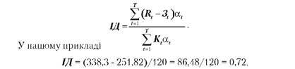 Критерій ефективності інвестиційного проекту виражається таким чином: ЧДД > 0. Позитивне значення чистого дисконтованого доходу говорить про те, що проект ефективний і може приносити прибуток у встановленому обсязі. Негативна величина чистого дисконтованого доходу (як у прикладі, табл. 11.5) свідчить про неефективність проекту (тобто при заданій нормі прибутку проект приносить збитки підприємству і/або його інвесторам). Індекс доходності (ІД) проекту дає змогу визначити, чи зможе поточний дохід від проекту покрити капітальні вкладення в нього. Він розраховується за формулою: