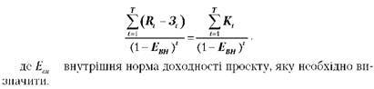 Ефективним вважається проект, індекс доходності якого вищий за одиницю, тобто сума дисконтованих поточних доходів за проектом перевищує величину дисконтованих капітальних вкладень. Проект, що розглядається нами, неефективний, оскільки індекс доходності менший одиниці від 0, 72. Внутрішня норма доходності (ВНД) – це та норма (ставка) дисконту, при якій величина доходів від поточної діяльності підприємства в процесі реалізації рівна наведеним (дисконтним) капітальним вкладенням. Внутрішня норма доходності визначається розв'язуванням такого рівняння:
