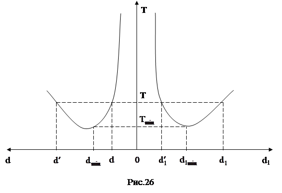 Как видно из (28), для нахождения ускорения силы тяжести достаточно измерить величины: расстояние (d + d1) между опорными ребрами призм и период колебаний маятника в положении d и в “перевернутом” положении d1 T(d) = T(d1) = T. Но добиться совпадения указанных периодов практически очень сложно. Следовательно, необходимо выяснить, при каких расхождениях периодов На рис.26 представлен качественный вид зависимости периода колебаний от расстояний d и d1 опорных призм до центра масс. Из графика видно, что по каждую сторону от центра масс маятника имеется по два положения опорных призм, при которых периоды оборотного маятника совпадают (d и d1; d/ и d1/ ). Поэтому целесообразно подготовить оборотный маятник к измерениям следующим образом.