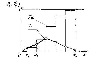 График функции (2.7) (ступенчатая ломаная) и многоугольник (полигон) распределения, соответствующий табл. (2.1), показаны на рис. 2.1.