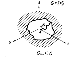Функционал Ф определен на процессе х (t), если каждой траектории х (t) ставится в соответствие некоторое число Ф[ х (t)]. Показатель надежности j определяется как математическое ожидание от этого функционала, т.е. j =М Ф[ х (t)]. (3.1) Такой подход фактически состоит в том, что каждой траектории процесса мы приписываем некоторый вес (значимость), а затем за показатель надежности принимаем среднее значение этого веса (рис. 3.1). Задано фазовое пространство G = { х }. В нем определено подмножество G откÌ G, в котором система будет считаться неработоспособной, т. к. ее состояние х (t) Î G. Отказ системы наступит тогда, когда траектория х (t)достигнет границы подмножества G отк и войдет в него. Количественный показатель надежности системы в каждой точке траектории будет определяться некоторым числовым значением, определяемым по формуле (3.1). Такова в общем виде методика подхода к определению характеристик надежности.