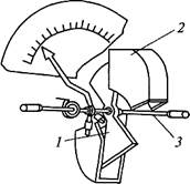 Достоинства: не потребляют энергии в цепях постоянного тока и имеют очень незначительное потребление в цепях переменного тока; классы точности: 0, 05; 0, 1; 1, 0; 1, 5; 2, 5; частотный диапазон 20 Гц... 10 МГц, диапазон измерений постоянного напряжения 10 В...7500 кВ, переменного напряжения 30 В...7500 кВ; независимость показаний от изменения температуры, частоты и формы кривой измеряемого напряже- Рис.4.9. Схема устройства ния, а также внешних магнитных полей. электростатического прибора: Недостатки: низкая чувствительность, неравномерная 1 – подвижная алюминиевая шкала, сказывается влияние внешних электрических и пластина; 2 – неподвижная электростатических полей. пластина; 3 – ось. Применение: в цепях постоянного и переменного токов в качестве вольтметров. Для расширения пределов измерения по напряжению используются резисторные и емкостные делители напряжения. Индукционные измерительные приборы (ИИП). В ИИП особым расположением катушек получают вращающееся электромагнитное поле, которое, пронизывая алюминиевый цилиндр, индуцирует в нем вихревые токи, что вызывает возникновение вращающего момента. С помощью спиральных бестоковых пружин создается противодействующий момент и обеспечивается пропорциональность измеряемой величины отклонению подвижной системы.