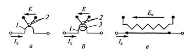 а б Рис. 2.11. Схемы включения прибора с однополупериодным (а) и двух-полупериодным (б) выпрямителями Достоинства: высокая чувствительность, малое собственное потребление мощности, широкий частотный диапазон — возможность работы без частотной компенсации на частотах до 2000 Гц, с частотной компенсацией — до 20 кГц. Недостатки: зависимость показаний от формы кривой измеряемого напряжения, необходимость введения частотной и температурной компенсации, невысокая точность (1, 0; 1, 5; 2, 5; 4) из-за нелинейности вольт-амперных характеристик диодов. Применение: выпрямительные приборы широко используют в качестве комбинированных приборов для измерения постоянных и переменных токов, напряжения и сопротивления — ампервольт-омметры (авометры). Диапазон измерений по току — 0, 2 мА...6 А, по напряжению 0, 2мВ...600 В. Термоэлектрические приборы. Эти приборы представляют собой сочетание магнитоэлектрического механизма с отсчетным устройством и термоэлектрического преобразователя. Термоэлектрический преобразователь состоит из одной или нескольких термопар и нагревателя, по которому протекает измеряемый ток. Нагреватель обычно изготовляется из материала с большим удельным сопротивлением (нихром, константан, вольфрам) с допустимой температурой 600... 800 °С. Для термопары подбирают материалы, дающие в паре высокую термоЭДС, обладающие устойчивыми термоэлектрическими характеристиками (хромель — копель, медь — копель и др.). Различают контактные термоэлектрические преобразователи, у которых горячий спай термопары 2приварен к нагревателю 1(рис. 4.12, а), и бесконтактные термоэлектрические преобразователи (рис. 4.12, б), у которых нагреватель 1 и горячий спай разделены изолятором 3(каплей стекла), что уменьшает чувствительность и увеличивает инерционность преобразователя. Преимуществом бесконтактных преобразователей является изоляция цепи термопары от нагревателя и возможность создания термобатарей (рис. 4.12, в). Под действием теплоты, выделяемой нагревателем, и при разности температур горячего и холодного спаев термопары возникает термоЭДС Е, пропорциональная току IХ, протекающему по нагревателю, и измеряемая магнитоэлектрическим ИМ.