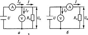 В настоящее время необходимо измерять мощность и энергию постоянного тока; активную мощность и энергию переменного однофазного и трехфазного токов; реактивную мощность и энергию трехфазного переменного тока; мгновенное значение мощности, а также количество электричества в очень широких пределах. Электрическая мощность определяется работой, совершаемой источником электромагнитного поля в единицу времени. Активная (поглощаемая электрической цепью) мощность Pа= UIcos φ = I2R = U2/R, где U, I — действующие значения напряжения и тока; φ — угол сдвига фаз между ними. Реактивная мощность Pр= UIsin φ = I2X Полная мощность Pп= UI = I2Z Активная, реактивная и полная мощности связаны выражением P= √ Pа 2+ Pр 2 Так, мощность измеряется в пределах 1 Вт... 10 ГВт (в цепях постоянного и однофазного переменного токов) с погрешностью ±(0, 01...0, 1) %, а при СВЧ ±(1...5) %; реактивная мощность — от единиц вар до Мвар с погрешностью ±(0, 1...0, 5) %. Диапазон измерения электрической энергии определяется диапазонами измерения номинальных токов (1 нА...1О кА) и напряжений (1 мкВ... 1 MB), погрешность измерения ±(0, 1...2, 5) %. Измерение реактивной энергии представляет интерес только для промышленных трехфазных цепей. Измерение мощности в цепях постоянного тока. При косвенном измерении мощности используют методы амперметра и вольтметра, а также компенсационного метода. Метод амперметра и вольтметра. В этом случае приборы включаются по двум схемам (рис. 8.1). Метод прост, надежен, экономичен, но обладает рядом существенных недостатков: необходимостью снимать показания по двум