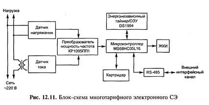 Сигналы, пропорциональные значениям напряжения и тока в сети, поступают через соответствующие датчики на входы микросхемы КР1095ПП1, преобразующей аналоговый сигнал на входе в частоту следования импульсов на выходе. Микроконтроллер MC68HC05KJ1 подсчитывает количество пришедших импульсов, преобразовывая его в значения потребленной энергии в Вт • ч. Результат выводится на дисплей и записывается во флэш-память. Если происходит сбой при временном исчезновении напряжения сети, информация о накопленной энергии сохраняется во флэш-памяти. После восстановления питающего напряжения эта информация считывается микроконтроллером, выводится на индикатор, и счет продолжается с этой величины. Реализация такого алгоритма требует менее 1 Кбайта памяти микроконтроллера. Примененный в данной схеме микроконтроллер MC68HC05KJ1 выпускается в 16-выводном корпусе (DIP или SOIC), имеет 1, 2 Кбайт ПЗУ и 64 байт ОЗУ. Его стоимость в исполнении ОТР (One Time Programmable — однократно программируемый) меньше 1 долл. Для хранения накопленной информации при сбоях питания служит флэш-ПЗУ малого объема 24С01 (128 байт памяти). В качестве дисплея используется простейший 6...8-разрядный 7-сегментный ЖКИ, управляемый контроллером К1820ВГ2. Учитывая стоимость этих компонентов, преобразователя КР1095ПП1, а также остальных компонентов счетчика (токового трансформатора, источника питания, печатной платы и так далее), получается, что стоимость такой системы (не считая корпуса) составляет не более 10 долл. В случае реализации многотарифного СЭ, устройство должно обеспечивать обмен информацией с внешними устройствами по стандартному каналу связи и управления RS-485. Он может использоваться для задания тарифов, инициализации и коррекции таймера реального времени, получения информации о накопленных значениях энергии и так далее. Блок-схема такого устройства, реализованного на микроконтроллере фирмы Motorola MC68HC05L16, представлена на рис. 12.11.