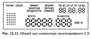Рассмотрим алгоритм работы счетчика. Память энергонезависимого ОЗУ разбита на 13 банков, в каждом из которых хранится информация о потребленной энергии по четырем тарифам: общем, льготном, пиковом и штрафном. В первом банке накапливаются данные с момента начала эксплуатации счетчика, следующие 12 банков соответствуют накоплениям за 11 предыдущих и за текущий месяцы. Количество потребленной энергии за месяц записываются в соответствующий банк, и таким образом имеется возможность определить, сколько было истрачено энергии за любой из 11 предшествующих месяцев. Перед началом эксплуатации счетчика на заводе-изготовителе обнуляют содержимое банков памяти, т. е. накопление начинается с нулевых значений. Переключение тарифов осуществляется по временным критериям: для каждого дня недели определяется свое тарифное расписание, т. е. времена начала основного и льготного тарифов и от нуля до трех интервалов времени — для пикового тарифа. До 16 произвольных дней в году могут быть определены как праздничные, в эти дни работает тарифное расписание для воскресенья. В счетчике может быть установлен режим ограничения по мощности и по количеству израсходованной за месяц энергии. В этом режиме счетчик фиксирует количество энергии, израсходованной сверх лимита. При превышении установленного лимита энергии производится либо переход на счет по штрафному тарифу, либо отключение пользователя от энергосети. Штрафной тариф также может быть установлен по каналу связи в случае, например, задолженности по оплате. Каждый раз при включении счетчика в сеть (скажем, после очередного пропадания напряжения в сети) фиксируется время и дата этого момента для возможности последующего контроля. Также предусмотрена запись времени и даты несанкционироанного снятия крышки устройства. Через специальный разъем к счетчику можно подключить индивидуальную электронную карточку потребителя с информацией о количестве оплаченной энергии. При исчерпании оплаченного лимита счетчик отключает потребителя от энергосети. Наличие режима нескольких тарифов позволяет выводить на дисплей дополнительную информацию о количестве потребления энергии по различным тарифам. Внешний вид дисплея такого счетчика представлен на рис. 12.12. Значение количества потребленной энергии выводится на 8 нижних разрядах (максимальное значение 99 999, 999 кВт • ч). Информация периодически изменяется (с промежутком в несколько секунд), последовательно показывая содержимое накоплений по каждому из тарифов и сумму этих накоплений. Вначале эти данные выводятся за текущий месяц (высвечивается надпись «за месяц») и затем с момента эксплуатации счетчика (высвечивается надпись «всего»).