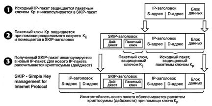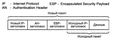 VPN-туннель обладает всеми свойствами защищенной выделенной линии, проходящей через открытое пространство Internet. Особенность технологии туннелирования состоит в том, что она позволяет зашифровать не только поле данных, а весь исходный пакет, включая заголовки. Это важная деталь, так как из заголовка исходного пакета злоумышленник может извлечь данные о внутренней структуре сети — например, информацию о количестве локальных сетей и узлов и их IP-адресах. Зашифрованный пакет, называемый SKIP-пакетом, инкапсулируется в другой пакет с открытым заголовком, который транспортируется по соответствующему туннелю (рис. 6.19). При достижении конечной точки туннеля из внешнего пакета извлекается внутренний, расшифровывается, и его заголовок используется для дальнейшей передачи во внутренней сети или подключенному к локальной сети мобильному пользователю. Туннелирование применяется не только для обеспечения конфиденциальности внутреннего пакета данных, но и для его целостности и аутентичности, механизм туннелирования часто применяется в различных протоколах формирования защищенного канала связи. Технология позволяет организовать передачу пакетов одного протокола в логической среде, использующей другой протокол. Таким образом, можно реализовать взаимодействие нескольких разнотипных сетей, преодолевая несоответствие внешних протоколов и схем адресации.