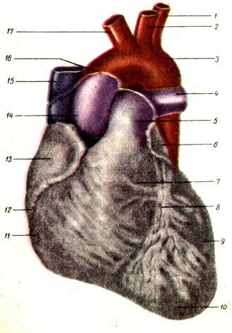 Сердце (cor), совершая ритмичные сокращения и расслабления, нагнетает кровь в артериальные сосуды и присасывает ее из венозных сосудов, чем обеспечивает кровообращение. Сердце начинает сокращаться еще задолго до рождения и продолжает свою деятельность до конца жизни человека. Расположено сердце в грудной полости, в нижнем отделе переднего средостения, в основном слева от срединной плоскости. В соответствии с конусообразной формой сердца в нем выделяют верхушку и основание. Верхушка направлена вниз, кпереди и влево, а основание - вверх, кзади и направо. На сердце различают грудино-реберную (переднюю), диафрагмальную (нижнюю) и легочные (боковые) поверхности, правый и левый края, венечную и две (передняя и задняя) межжелудочковые борозды.