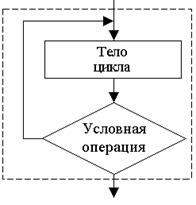 Третий структурный оператор - это оператор цикла с проверкой условия после тела цикла. Отличие от условного оператора заключается в том, что передача управления осуществляется не вперёд, а назад. На языках программирования высокого уровня такой оператор входит в состав языка (оператор do..while в языке программирования C или оператор repeat..until в языке программирования PASCAL).