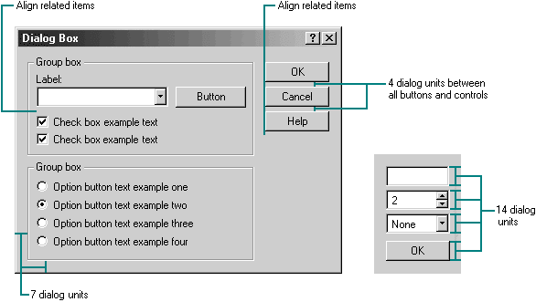 Рис. 15. Рекомендуемое расположение элементов интерфейса (1 DLU = 2 пикселя (мелкий шрифт), Командные кнопки следует располагать прижатыми к правому краю. Расстояние между соседними кнопками должно быть 8 пикселей. Кнопка «ОК», либо кнопка «Старт», должна располагаться рядом с кнопкой «Отмена». Если случайное нажатие на кнопку «ОК», либо кнопку «Старт», может привести к ошибочным действиям программы, то в таком приложении кнопкой «По умолчанию» (Default), следует назначить кнопку «Отмена» либо «Выход». Каждой функциональной кнопке, требуется назначить клавишу быстрого доступа. Не допускается применение кнопок с пиктограммами или картинками совместно с текстом. Не рекомендуется выделять цветовой схемой элементы управления. При необходимости для привлечения внимания пользователя можно воспользоваться всплывающей подсказкой (Hint). Информация, выводимая в окнах сообщений должна полностью отражать суть произошедшей ситуации, и кроме того должна содержать краткие рекомендации по дальнейшим действиям пользователя. Допускается применение в окнах сообщений стандартных пиктограмм Windows. Не допускается применение пиктограммы, смысл которой не соответствует информации выводимой в окне сообщения.