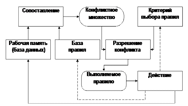 Несмотря на все недостатки, наибольшее распространение получила продукционная модель представления знаний. При использовании продукционной модели база знаний состоит из набора правил. Программа, управляющая перебором правил, называется машиной вывода. Машина вывода (интерпретатор правил) выполняет две функции: во-первых, просмотр существующих фактов из рабочей памяти (базы данных) и правил из базы знаний и добавление (по мере возможности) в рабочую память новых фактов и, во-вторых, определение порядка просмотра и применения правил. Этот механизм управляет процессом консультации, сохраняя для пользователя информацию о полученных заключениях, и запрашивает у него информацию, когда для срабатывания очередного правила в рабочей памяти оказывается недостаточно данных. В подавляющем большинстве систем, основанных на знаниях, механизм вывода представляет собой небольшую по объему программу и включает два компонента — один реализует собственно вывод, другой управляет этим процессом. Действие компонента вывода основано на применении правила, называемого modus ponens. Правило modus ponens. Если известно, что истинно утверждение А и существует правило вида «ЕСЛИ А, ТО В», тогда утверждение В также истинно. Правила срабатывают, когда находятся факты, удовлетворяющие их левой части: если истинна посылка, то должно быть истинно и заключение. Компонент вывода должен функционировать даже при недостатке информации. Полученное решение может и не быть точным, однако система не должна останавливаться из-за того, что отсутствует какая-либо часть входной информации. Управляющий компонент определяет порядок применения правил и выполняет четыре функции: Сопоставление — образец правила сопоставляется с имеющимися фактами. Выбор — если в конкретной ситуации может быть применено сразу несколько правил, то из них выбирается одно, наиболее подходящее по заданному критерию (разрешение конфликта). Срабатывание — если образец правила при сопоставлении совпал с какими-либо фактами из рабочей памяти, то правило срабатывает. Действие — рабочая память подвергается изменению путем добавления в нее заключения сработавшего правила. если в правой части правила содержится указание на какое-либо действие, то оно выполняется (как, например, в системах обеспечения безопасности информации).