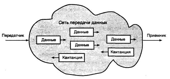 В любой системе либо сети передачи данных возникают ситуации, когда поступающая в сеть нагрузка превышает возможности по ее обслуживанию. В этом случае, если не предпринимать никаких мер по ограничению поступающих данных (графика), размеры очередей на линиях сети будут неограниченно расти и в конце концов превысят размеры буферов соответствующих средств связи. Когда это происходит, единицы данных (сообщения, пакеты, кадры, блоки, байты, символы), поступающие в узлы, для которых нет свободного места в буфере, будут сброшены и позднее переданы повторно. В результате возникает эффект, когда при увеличении поступающей нагрузки реальная пропускная способность уменьшается, а задержки передачи становятся чрезвычайно большими. Средством борьбы с такими ситуациями выступают методы управления потоком, суть которых заключается в ограничении поступающего трафика для предотвращения перегрузок. Схема управления потоком может понадобиться на участке передачи между двумя пользователями (транспортный уровень), между двумя узлами сети (сетевой уровень), между двумя соседними DCE, обменивающимися данными по логическому каналу (канальный уровень), а также между терминальным оборудованием и аппаратурой канала данных, взаимодействующих по одному из интерфейсов DTE—DCE (физический уровень). Схемы управления потоком транспортного уровня реализованы в протоколах передачи файлов, таких как ZModem; схемы управления потоком сетевого уровня — в составе протоколов Х. 25 и TCP/IP; схемы управления потоком канального уровня — в составе протоколов повышения достоверности, таких как MNP4, V. 42; управление потоком на физическом уровне реализуется в рамках набора функций соответствующих интерфейсов, таких как RS-232. Перечисленные три уровня схем управления имеют непосредственное отношение к аппаратному и программному обеспечению модемов и их конкретные реализации будут рассмотрены в соответствующих разделах книги. Рассмотрим часто используемый протоколами канального, сетевого и транспортного уровней класс методов управления потоком, названный оконным управлением потоком. Под окном понимается наибольшее число информационных единиц, которые могут оставаться неподтвержденными в данном направлении передачи. В процессе передачи между передатчиком и приемником используется оконное управление, если установлена верхняя граница на число единиц данных, которые уже переданы передатчиком, но на которые еще не получено подтверждение от приемника. Верхняя граница в виде целого положительного числа и является окном или размером окна. Приемник уведомляет передатчик о том, что к нему попала единица данных, путем отправления специального сообщения к приемнику (Рисунок 26). Такое сообщение называется подтверждением, разрешением или квитанцией. Подтверждение может быть положительным — АСК (ACKnowledgement), сигнализирующим об успешном приеме соответствующей информационной единицы, и отрицательным — NAK (Negative AcKnowledgement), свидетельствующим о неприеме ожидаемой порции данных. После получения квитанции передатчик может передать еще одну единицу данных приемнику. Число квитанций, находящихся в использовании, не должно превышать размер окна.