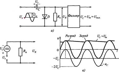 Рис. 7.1. Амплитудный детектор с параллельным диодом: а — принципиальная схема; б — эквивалентная схема; в — временные диаграммы Изменение напряжения на сопротивлении нагрузки RH определяется разностью амплитуды входного напряжения Ux и напряжения на конденсаторе Uc, т.е. Ur = Ux - Uq- Таким образом, выходное напряжение Ur будет пульсирующим с удвоенной амплитудой измеряемого напряжения, как показано на рис. 7.1, в. Для выделения постоянной составляющей сигнала U= = - Uc на выходе детектора ставится емкостной фильтр, подавляющий остальные гармоники. Одним из достоинств аналоговых вольтметров с амплитудным детектором является независимость показаний прибора от формы сигнала. Обычно шкала амплитудных вольтметров градуируется в средних квадратических значениях синусоидального напряжения, т.е. показания прибора: Unp= Um/Ka. Детектор среднего квадратического значения — преобразователь переменного напряжения в постоянное, пропорциональное корню квадратному из среднего квадрата мгновенного значения напряжения. Значит, измерение действующего напряжения связано с выполнением трех последовательных операций: возведение в квадрат мгновенного значения сигнала, усреднение и извлечение корня из результата усреднения (усреднение обычно осуществляется при градуировке шкалы вольтметра). Возведение в квадрат осуществляют полупроводниковой ячейкой, используя параболический участок его характеристики, близкий по форме к квадратичной линии; иногда этот участок создают искусственно. На рис. 7.2, а представлена диодная ячейка DtRlc, в которой постоянное напряжение Ех приложено к диоду D} таким образом, что он оказывается закрытым до тех пор, пока измеряемое напряжение ux{t) на резисторе Rx не превысит величины Ех. Следует иметь в виду, что начальный квадратичный участок вольтамперной
