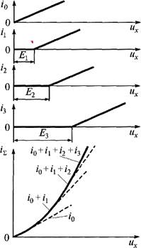 Рис. 7.2. Детектор среднего квадратического значения: а — диодная ячейка; б — идеализированная характеристика; в — схема квадратичного детектора характеристики полупроводникового диода имеет, как правило, малую протяженность (рис. 7.2, б), поэтому эту часть удлиняют искусственно. Линеаризация вольтамперной характеристики легко иллюстрируется методом кусочно-линейной аппроксимации. Для этого в схеме детектора используют несколько диодных ячеек (рис. 7.2, в), аналогичных показанной на рис. 7.2, а Линейный участок обобщенной вольтамперной характеристики при этом увеличивается. На рис. 7.3 показано, как получается в этом случае квадратичная характеристика при последовательном включении цепочек резисторов Rlc, R2c, R3c с диодами D1, D2, D3. Диод D1 первоначально закрыт напряжением Е1 затем, по мере роста напряжения ux{t) и достижения соотношения ux(t) > Е1, он открывается и начальный линейный участок его идеализированной характеристики увеличивается. В схеме, представленной на рис. 7.2, в, первоначально диоды D1, D2, D3 закрыты соответствующими напряжениями смещения Е1, Е2, Е3, и при малом входном напряжении ux(t) ток через миллиамперметр равен i0. Когда входное напряжение ux(t) > E1 откроется диод D1 и параллельно резистору Ro подключится делитель напряжения R1, R1c- В результате крутизна вольтамперной характеристики на участке от Е1 до Е2 возрастает; суммарный ток протекающий через миллиамперметр