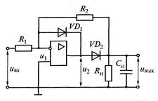 i∑ = i0 + i1 + i2. При ux(t) > Е3, откроется диод D3 и суммарный ток, протекающий через миллиамперметр, будет равен i∑ = i0 + i1 + i2 + i3- В результате форма суммарной вольтамперной характеристики приблизится к квадратичной кривой. Показание измерительного прибора будет пропорциональным среднему квадратическому значению входного напряжения и оно не зависит от его формы. При конструировании приборов действующего значения возникает целый ряд трудностей, в том числе и с обеспечением широкого частотного диапазона. Тем не менее эти приборы являются самыми востребованными, так как они позволяют измерять напряжение любой сложной формы. Детектор средневыпрямленного значения — устройство, преобразующее переменное напряжение в постоянный ток, пропорциональный средневыпрямленному значению напряжения. Структура выходного тока измерительного прибора с детектором средневыпрямленного значения аналогична ранее рассмотренному узлу выпрямительной системы. Аналоговый электронный вольтметр средневыпрямленного значения имеет более высокую чувствительность и меньшее потребление мощности от измерительной цепи (за счет дополнительного усиления), чем прибор со схемой выпрямления без усилителя. Интегральные амплитудные детекторы. Диодные (как и транзисторные) амплитудные детекторы при малых напряжениях вносят в измеряемый сигнал значительные нелинейные искажения. Поэтому в измерительных устройствах применяют амплитудные детекторы на интегральных микросхемах — операционных усилителях — ОУ (рис. 7.4).