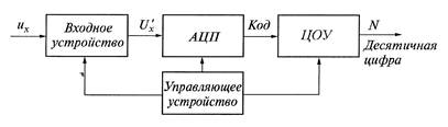 Рис. 7.4. Упрощенная структурная схема цифрового вольтметра Входное устройство содержит делитель напряжения; в вольтметрах переменного тока оно включает в себя также преобразователь переменного тока в постоянный. Аналого-цифровой преобразователь преобразует аналоговый сигнал в цифровой, представляемый цифровом кодом. Процесс аналогоцифрового преобразования составляет сущность любого цифрового прибора, в том числе и вольтметра. Использование в АЦП цифровых вольтметров двоично-десятичного кода облегчает обратное преобразование кода в десятичное число, отражаемое цифровым отсчетным устройством. Цифровое отсчетное устройство регистрирует измеряемую величину. Управляющее устройство объединяет все узлы вольтметра. По типу АЦП цифровые вольтметры делят на две основные группы: • кодоимгтульсные (с поразрядным уравновешиванием); • времяимпульсные. Аналого-цифровой преобразователь вольтметров преобразуют сигнал постоянного тока в цифровой код, поэтому и цифровые вольтметры также считают приборами постоянного тока. Для измерения напряжения переменного тока на входе вольтметра ставится преобразователь в постоянное напряжение, чаще всего средневыпрямленного значения. Проанализируем основные технические характеристики среднестатистического цифрового вольтметра постоянного тока: • диапазон измерения: 100 мВ, 1 В, 10 В, 100 В, 1000 В; • входное сопротивление — высокое, обычно более 100 МОм; • порог чувствительности (другие названия — квант или единица дискретности) на диапазоне 100 мВ может быть 1 мВ, 100 мкВ, 10мкВ; • количество знаков (длина цифровой шкалы) — отношение максимальной измеряемой величины на этом диапазоне к минимальной; например: диапазону измерения 100 мВ при уровне квантования 10 мкВ соответствует (100* 10" 6)/(10 • 10~9) = 10 4 знаков; • помехозащищенность. Точность цифровых вольтметров. Распределение погрешности по диапазону измерения определяется пределом допускаемой относительной основной погрешности, характеризующей класс точности СИ: Быстродействие. Современные схемы АЦП, применяемые в цифровых вольтметрах, могут обеспечить очень большое быстродействие, однако из соображений точной регистрации полученного результата у цифровых вольтметров оно уменьшается примерно до 20-50 измерений в 1 с.