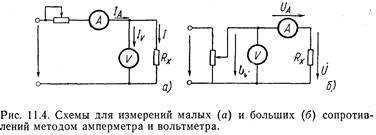 При косвенных измерениях разных сопротивлений Rx широко используют метод амперметра-вольтметра. Этот метод основан на раздельном измерении тока и напряжения с последующим вычислением сопротивления по закону Ома. Метод прост, надежен, но обладает невысокой точностью, ограниченной классом точности применяемых приборов и методической погрешностью, вносимой этими приборами. В зависимости от значения сопротивления для измерения тока можно использовать милли- и микроамперметры, гальванометры; для измерения напряжения — милли- и микровольтметры, гальванометры. Погрешность измерения порядка 1, 5, 2 %. Обычно ток I измеряют амперметром, а напряжение U — вольтметром, этим объясняется название метода. При измерении высокоомных сопротивлений, например сопротивления изоляции, ток I мал и его измеряют миллиамперметром, микроамперметром или гальванометром. При измерении низкоомных сопротивлений, например куска провода, оказывается малым значение U и для его измерения применяют милливольтметры, микровольтметры или гальванометры. Однако во всех этих случаях метод измерения сохраняет свое наименование— амперметра и вольметра. Возможные схемы включения приборов показаны на рис. 11.4, а, б.