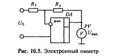 Из формулы (10.1) видно, что максимальное значение измеряемого сопротивления есть: Rx max = - R1(Uвых max/Uo). (10.2) Для изменения пределов измерений переключают значения сопротивления резистора R1, или напряжения Uo. При измерении низкоомных сопротивлений можно в схеме поменять местами измеряемый и вспомогательный резисторы. Тогда выходное напряжение будет обратно пропорционально величине Rx: Uвых = - Uo(R1/Rx). (10.3) Следует заметить, что данный способ включения не позволяет измерять низкоомные сопротивления менее десятков Ом, поскольку внутреннее сопротивление источника опорного напряжения, которое составляет доли или единицы Ом, оказывается включенным последовательно с измеряемым сопротивлением и вносит существенную погрешность в измерения. Кроме того, в этом случае теряется основное преимущество прибора — линейность отсчета измеряемого сопротивления, а сдвиг нуля и входной ток усилителя могут вносить существенные ошибки