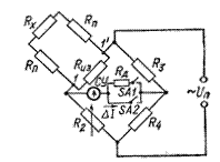 мерительного механизма. Последовательное включение применяется при измерении средних и больших сопротивлений, параллельное — при измерении малых сопротивлений. Дальнейшее рассмотрение работы омметра на основе логометра будем вести на примере схемы рис. 11.7, а. Если пренебречь сопротивлением обмоток рамок логометра, то угол поворота подвижной части α зависит только от отношения сопротивлений: Сопротивлением резистора R задается диапазон измеряемых омметром сопротивлений. Напряжение питания логометра влияет на чувствительность его измерительного механизма к изменению измеряемого сопротивления и не должно быть ниже определенного уровня. Обычно напряжение питания логометров устанавливают с некоторым запасом по отношению к минимально допустимому уровню для того, чтобы его возможные колебания не влияли на точность результата измерения. Значение напряжения питания и способ его получения зависят от назначения омметра и диапазона измеряемых сопротивлений: при измерении малых и средних сопротивлений применяют сухие батареи, аккумуляторы или источники питания от промышленной сети, при измерении больших сопротивлений, например, изоляции, — специальные генераторы с напряжением 100, 500, 1000 В и более. Логометрический метод применен в мегаомметрах ЭС0202/1Г и ЭС0202/2Г с внутренним электромеханическим генератором напряжения. Они применяются для измерения больших (105...109 Ом) электрических сопротивлений, для измерения сопротивления изоляции электрических проводов, кабелей, разъемов, трансформаторов, обмоток электрических машин и других устройств, а также для измерения поверхностных и объемных сопротивлений изоляционных материалов. При измерении с помощью мегаомметра сопротивления электрической изоляции следует учитывать температуру и влажность окружающего воздуха, от значения которых зависят возможные неконтролируемые утечки тока. Прямые измерения сопротивления Rx с высокой точностью осуществляют с помощью мостов постоянного тока. Мосты постоянного тока (одинарные). Диапазон измерения: 10 Ом...0, 1 ПОм (множитель 1015— приставка пета); классы точности: 0, 005... 10, 0.
