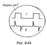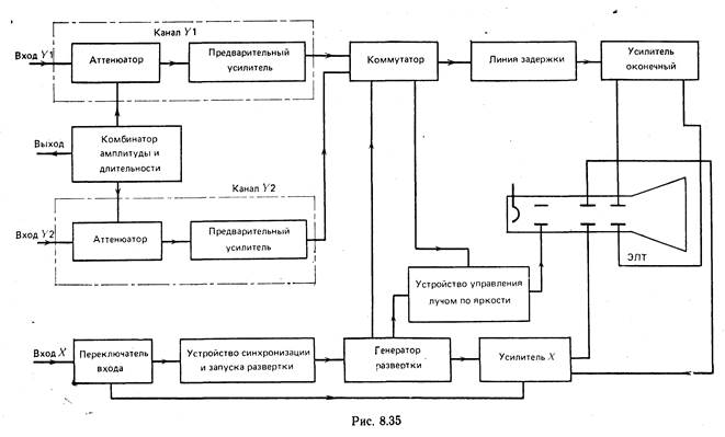 Наибольшее распространение получили приборы, позволяющие наблюдать одновременно два сигнала (рис. 8.33). Осциллограмма 1 представляет собой сигнал, поступающий на вход исследуемой цепи, а осциллограмма 2 — сигнал, снимаемый с выхода. Для получения такого изображения используется двухлучевая ЭЛТ, содержащая внутри общей колбы два электронных прожектора со своими системами фокусировки вертикально и горизонтально отклоняющих пластин. Обычно развертка обоих лучей осуществляется от общего генератора и усилителя горизонтального отклонения, что обеспечивает отображение обоих сигналов в едином масштабе времени. Единый масштаб времени позволяет сравнивать мгновенные значения напряжений, определять временные соотношения, измерять фазовый сдвиг и т. п. На рис. 8.34 изображена упрощенная структурная схема универсального двухлучевого осциллографа С1-55. Из схемы видно, что управление двумя лучами ЭЛТ осуществляется с помощью двух идентичных каналов У1 и Y2, содержащих те же элементы, что и каналы вертикального отклонения обычных осциллографов. Синхронизация автоколебательной и запуск ждущей разверток производится от исследуемого сигнала, снимаемого с усилителей обоих каналов. Особенностью ЭЛТ, применяемой в рассматриваемом приборе, является гашение луча во время обратного хода развертки с помощью специальных бланкирующих пластин. При подаче импульсов с устройства управления яркостью изображения на бланкирующие пластины лучи обоих электронных прожекторов резко отклоняются в сторону и не попадают на экран. Имеются ЭЛТ и с большим числом лучей. Так, в осциллографе С1-33 применена пятилучевая ЭЛТ. Возможности применения таких приборов еще более широкие.