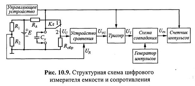 На рис. 10.9 показана структурная схема цифрового измерителя емкости и сопротивления, реализующая метод дискретного счета, а на рис. 10.10 — временные диаграммы к схеме.