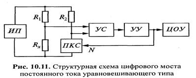 Наряду с методами прямого преобразования (дискретного счета) в практике используют также методы уравновешивающего преобразования измеряемых значений сопротивления, индуктивности и емкости, основанные на сравнении измеряемой величины с образцовой. Сравнение измеряемой величины с образцовой чаще всего осуществляют путем уравновешивания мостовой измерительной цепи, в одно из плеч которой включают исследуемый двухполюсник. В смежное плечо моста вводят образцовый элемент, представляющий собой набор квантованных образцовых мер, соответствующих весовым коэффициентам разрядов используемого цифрового кода. Изменением параметров образцового двухполюсника добиваются равенства нулю напряжения в измерительной диагонали. На рисунке показана структурная схема цифрового моста постоянного тока уравновешивающего типа для измерения активного сопротивления резистора или другого элемента с омическими потерями.