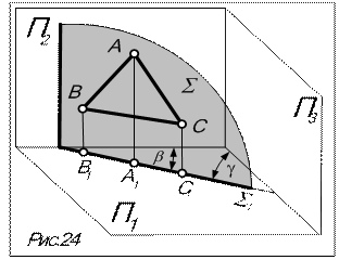 4.1.1.Плоскость общего положения Определение: плоскость, наклоненная ко всем плоскостям проекций (рис.23). Признак: ни на одну из плоскостей проекций определитель плоскости не проецируется на прямую (см. рис.22).