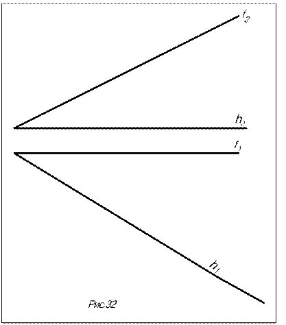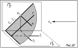 Восходящей называется плоскость, высота точек которой возрастает по мере удаления от наблюдателя, а нисходящей - плоскость, высота точек которой уменьшается по мере удаления от наблюдателя. Признак: у восходящей плоскости обход проекцийточек на обеих плоскостях проекций одинаковый (плоскости L и q на рис.22), у нисходящей – противоположный (плоскость S на рис.22). У восходящей плоскости видна на П1 и П2 одна и та же сторона, у нисходящей - разные стороны.