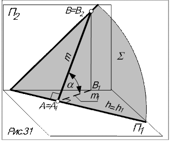 Признак: в плоскость проекций, параллельную линии уровня, прямой угол между линией наибольшего на-клона и линией уровня проецируется в натуральную величину. Прямая наибольшего наклона используется для определения вели-чины двугранного угла между плос-костью общего положения и какой-либо плоскостью проекций: двугран-ный угол измеряется линейным углом между линией наибольшего наклона плоскости и ее проекцией на соответствующую плоскость проекций. На рис.31 показана прямая наибольшего наклона m плоскости å к горизонтальной плоскости проекций (линия ската), проведенная перпендикулярно горизонтали h. При этом m1 ^ h 1. Угол a между линией ската m и её проекцией m1 и есть угол между плоскостями å и П1 .
