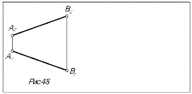 При плоскопараллельном перемещении точки (рис.47) траектория ее перемещения в параллельную плоскость проецируется в натуральную величину, а в другую плоскость - в виде прямой, параллельной оси проекций. При плоскопараллель-ном перемещении фигуры относительно какой-либо пло-скости проекций остаются неизменными удаления точек фигуры от этой плоскости, а значит, остается неизменным угол наклона фигуры к этой плоскости проекций. Следовательно, остается неизменной величина проекции фигуры в плоскость, относительно которой осуществляется плоскопараллельное перемещение, а проекции точек фигуры на другую плоскость проекций перемещаются по прямым, параллельным оси проекций. Задача. Сделать прямую АВ общего положения: а) прямой уровня; б) проецирующей прямой (рис.48). Чтобы сделать прямую общего положения прямой уровня, необходимо плоскопарал-лельное перемещение (ППП) относительно одной из плоскостей проекций. При этом проекция отрезка прямой в эту плоскость в новом положении без изменения величины выставляется параллельно оси проекций. Чтобы сделать прямую общего положения проецирующей нужны два последовательных ППП относительно обеих плоскостей проекций: первым перемещением относительно какой-либо плоскости проекций прямая общего положения делается прямой уровня, а вторым перемещением относительно другой плоскости проекций прямая уровня делается проецирующей. При этом проекция отрезка, равная его натуральной величине, выставляется перпендикулярно оси проекций.